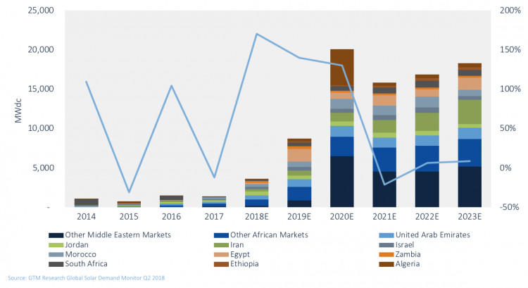 据GTMResearch的数据显示,2018年中东和非洲地区的光伏需求有望增长170%。