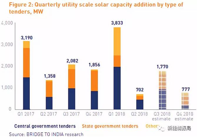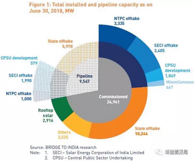 根据Bridge to india发布的报告,截止2018年6月30日,印度光伏累计装机24.941GW,其中包括地面电站22.025GW,屋顶光伏2.916GW。此外,尚有9.5GW的光伏项目招标工作已完成。