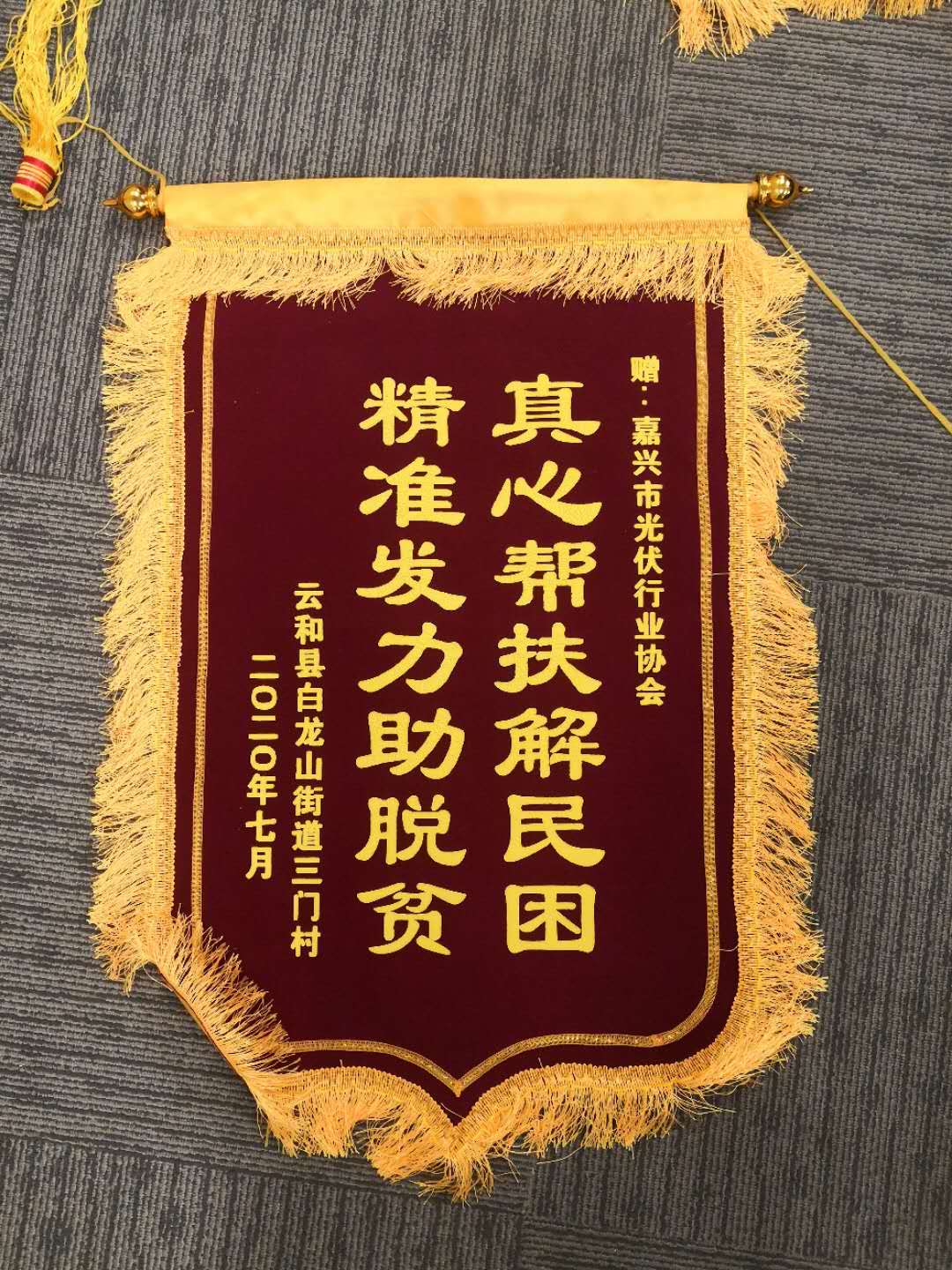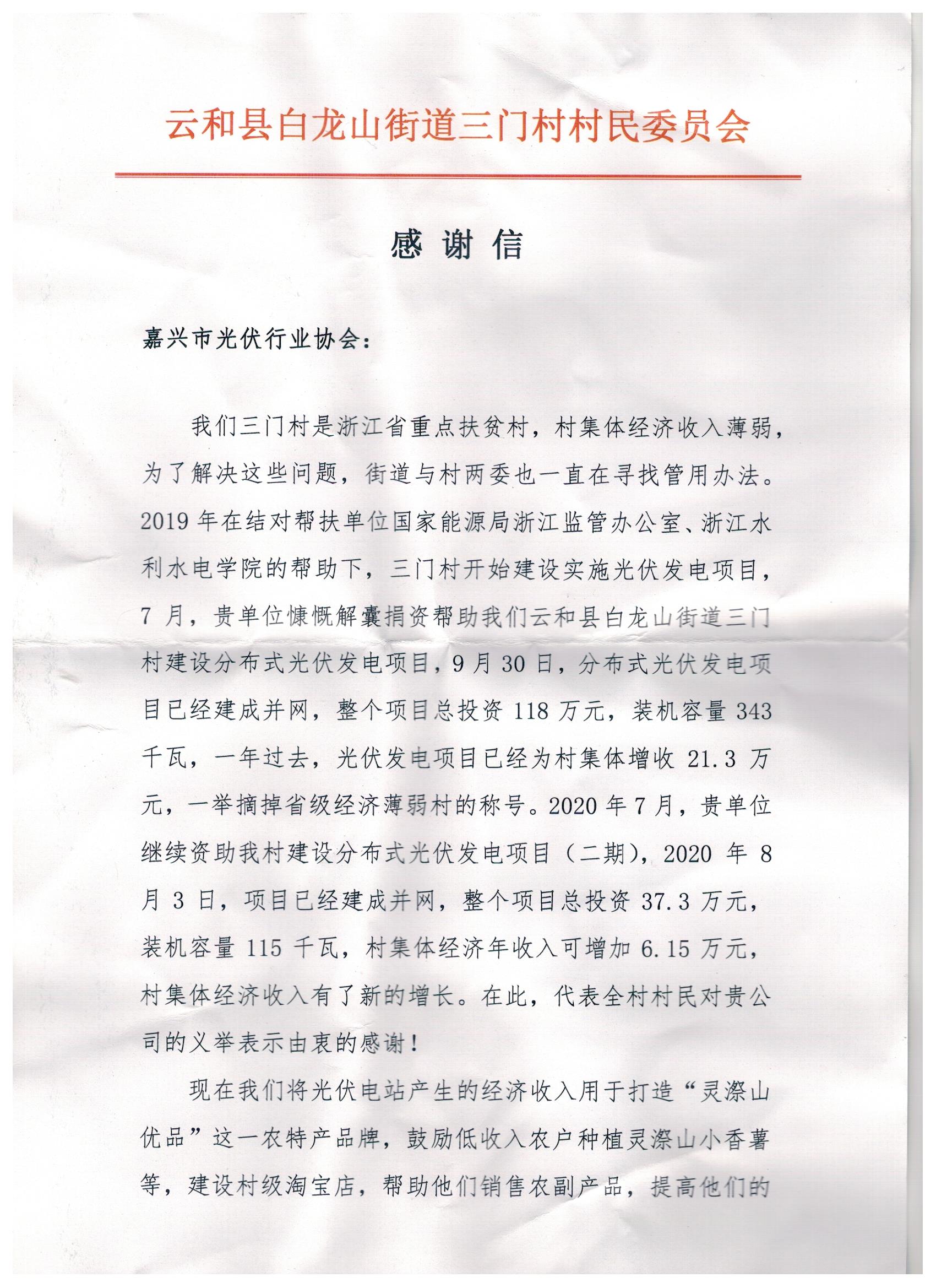 近日,嘉兴市光伏行业协会收到来自丽水云和县白龙山街道三门村送来的锦旗和感谢信,对协会近两年捐资帮助三门村建设分布式光伏发电项目、帮助村集体经济增收表示感谢。